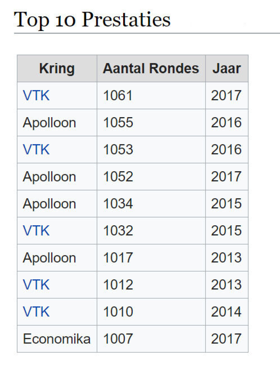 'Big Five' kringen VTK, Apolloon, Ekonomika, LBK en Medica' liepen intussen allemaal 100 rondjes af. Dat is 55km. Daar deden de kringen bijna net zo snel over als de snelste marathon-run (42,195 km) ooit, op naam van Eliud Kipchoge (2:01.39).