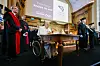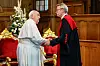De academische zitting is afgelopen. Paus Franciscus wordt nu naar het rectoraal salon begeleid, waar hij een ontmoeting heeft met enkele vluchtelingen. Morgen zal de paus een bezoek brengen aan de UCLouvain.